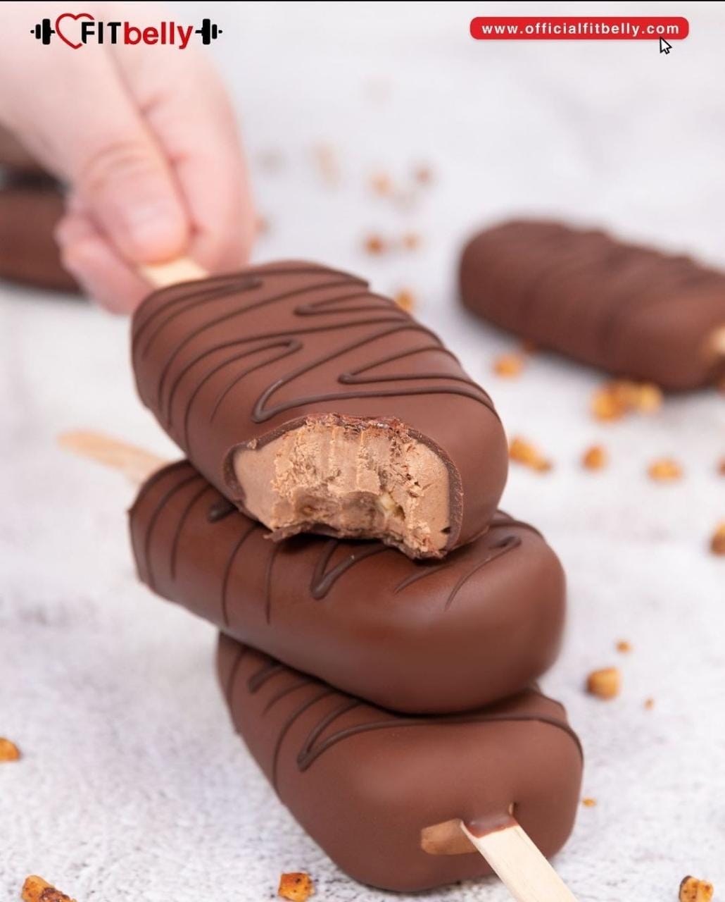 Our Kinder-style Sugar-free Ice Cream Bar is inspired by the iconic flavor combo of hazelnut and milk chocolate, but made the FitBelly way: 100% sugar-free, protein-rich from the greek yogurt it contains, and sweetened with monk fruit.